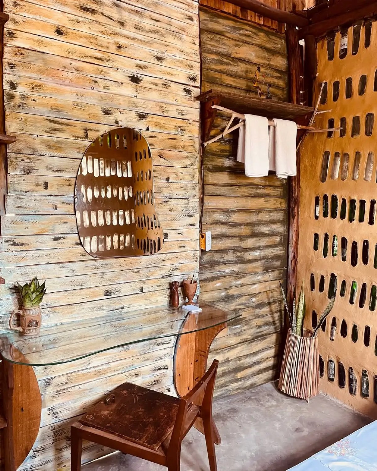 Edna and Maria Gabrielly decorated the seven bedrooms in a very similar way. In one of them, we can see how wood and other recycled materials make up all the furniture. In the living room, we can see that the Brazilians left the cement floor, decorated with a small patterned rug.